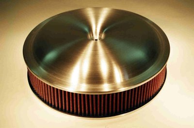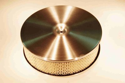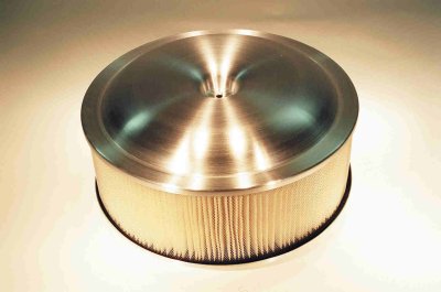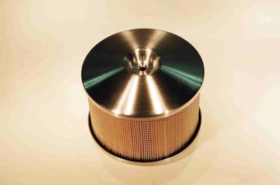 This filter assembly is available with a 4bbl flat base plate ( 5 1/8" air horn ) or a 2bbl flat base plate ( 3" round ). It has a paper filter that is 10" in diameter & stands 3" tall. Available with a K&N 10" x 3" air filter. |
